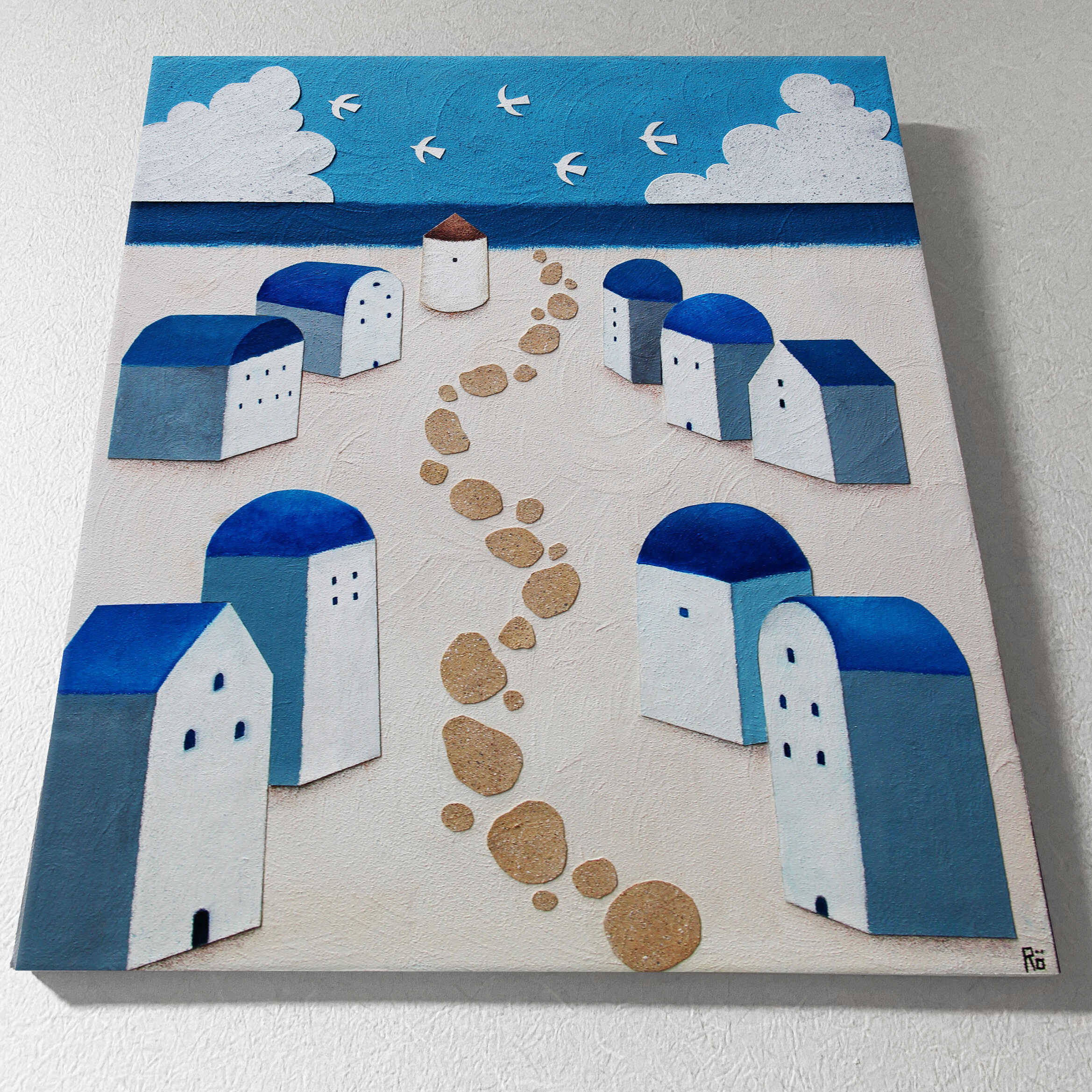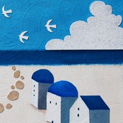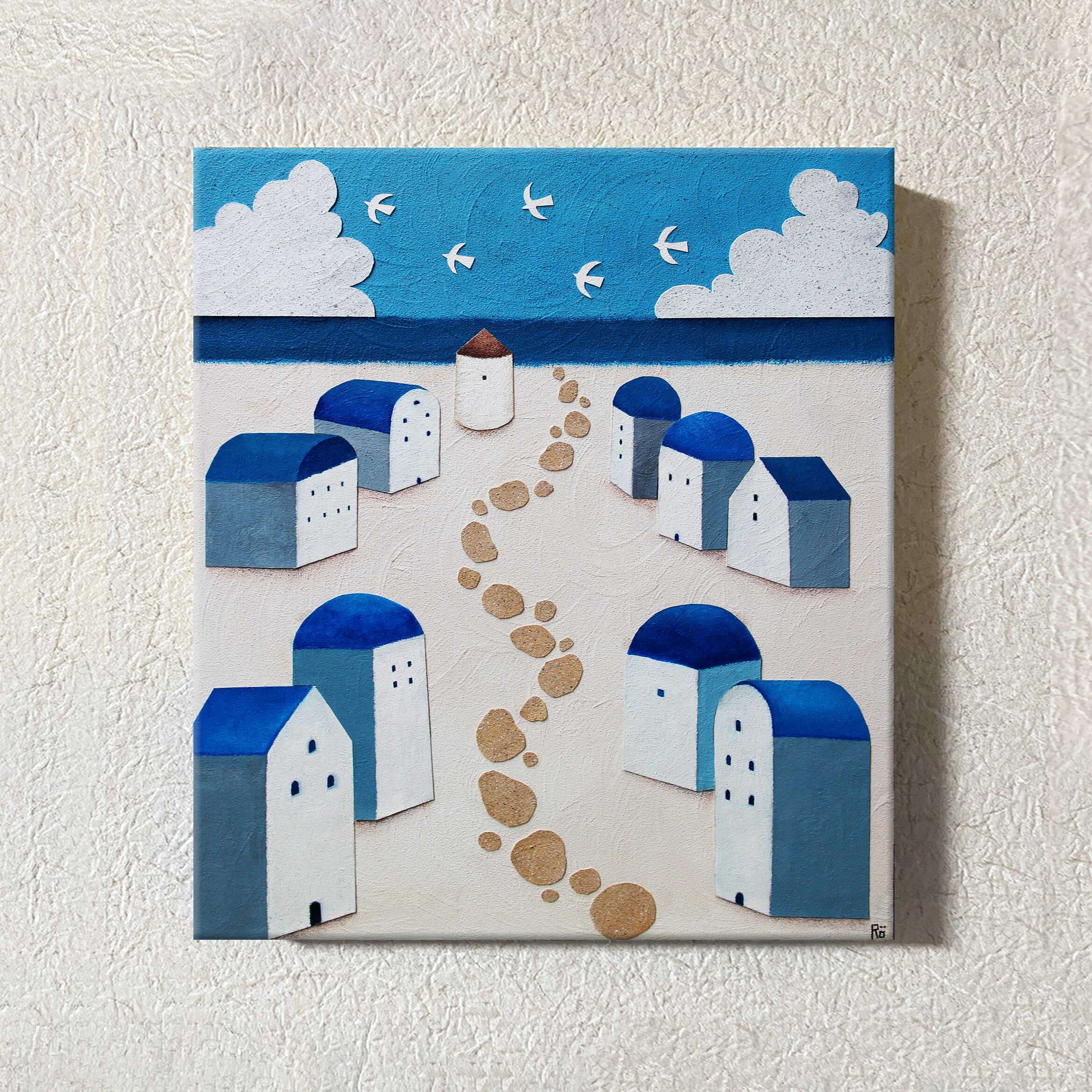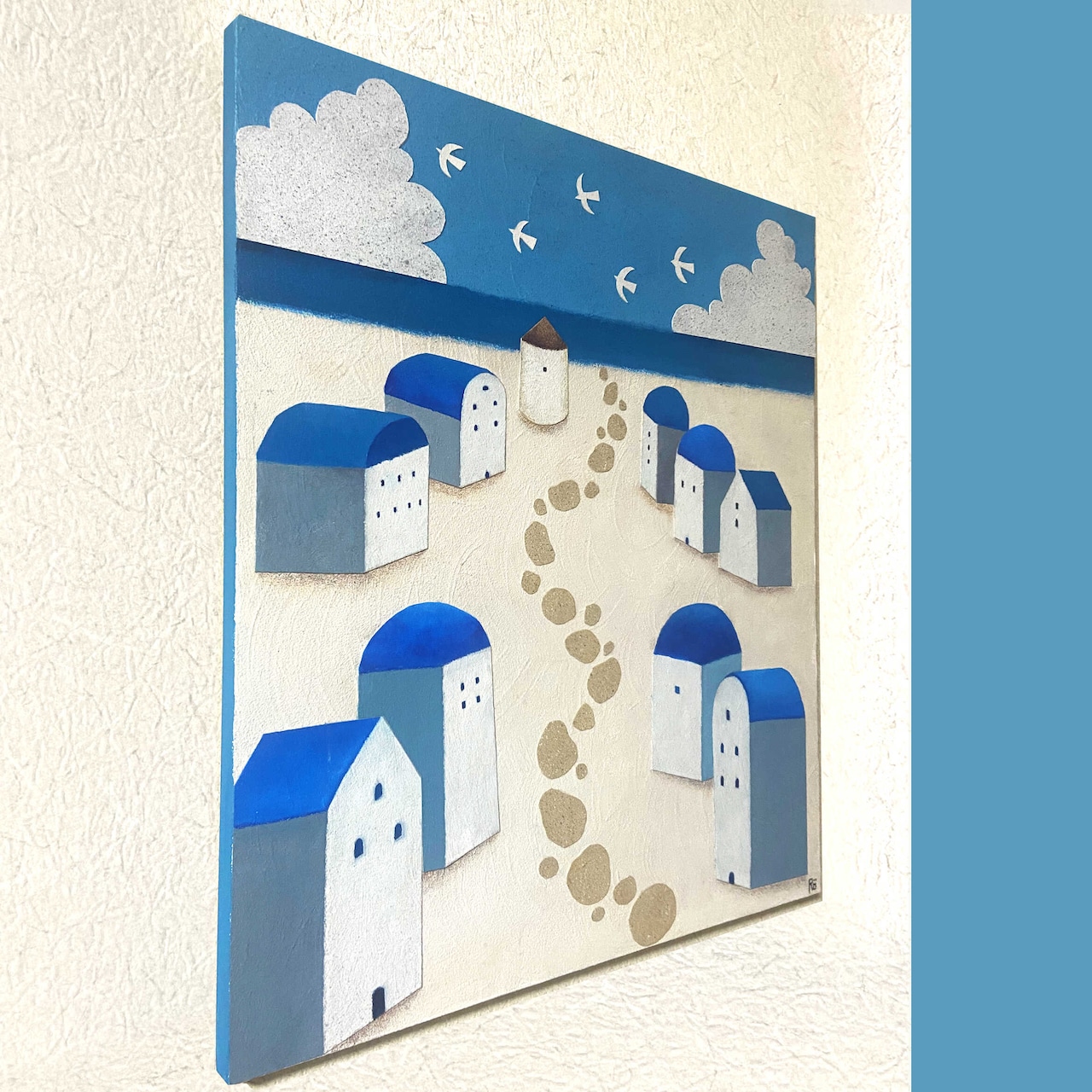 向かい合った青い屋根の美しい家々や海の上に浮かぶ白い雲から優しく吹く海風のような心地よさを感じていただけますと幸いです。