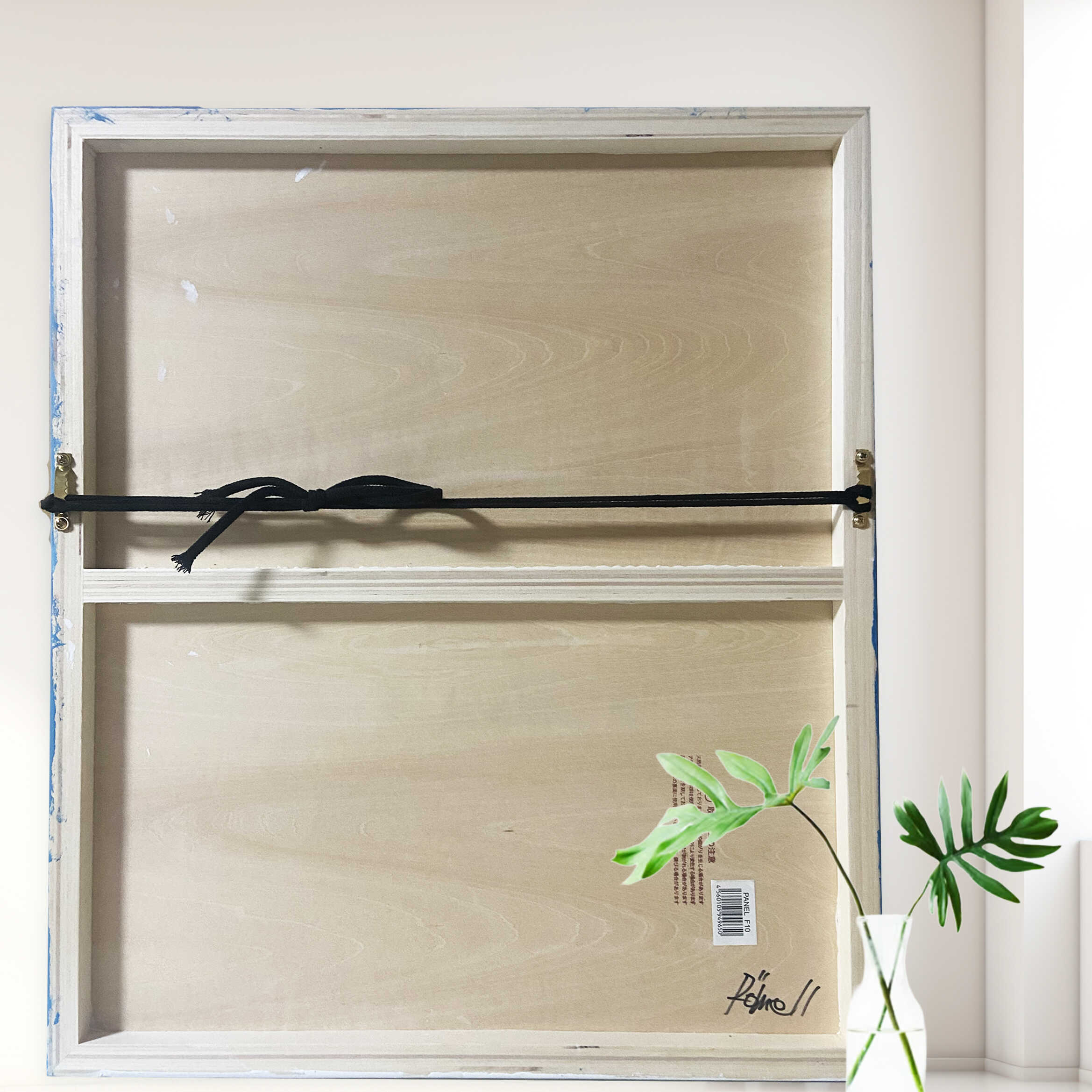 支持体に砂の塗料を使用し凹凸をつけ壁のような土台を作り、家には塗料に漬けた高級水彩紙に独自技法による無数の粒子で陶器のような質感を演出した作品です。