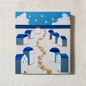 白く美しい町並みや目前に広がる青いエーゲ海の印象から青と白を中心に描きました。