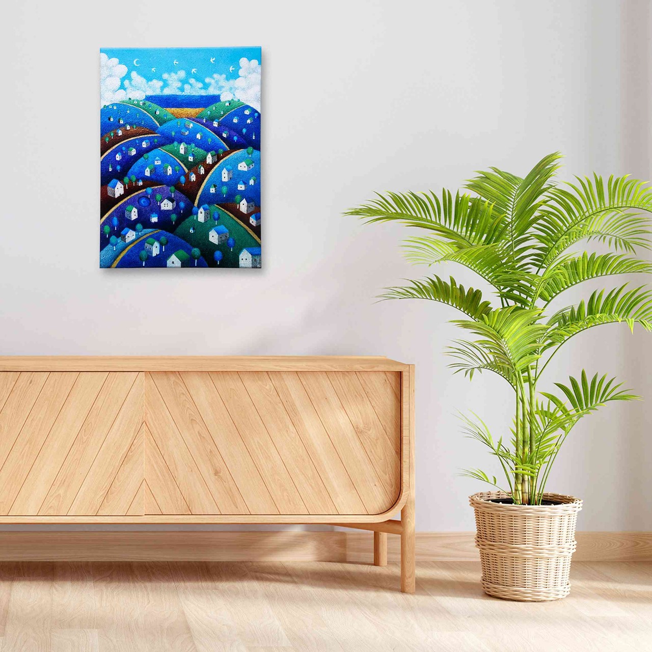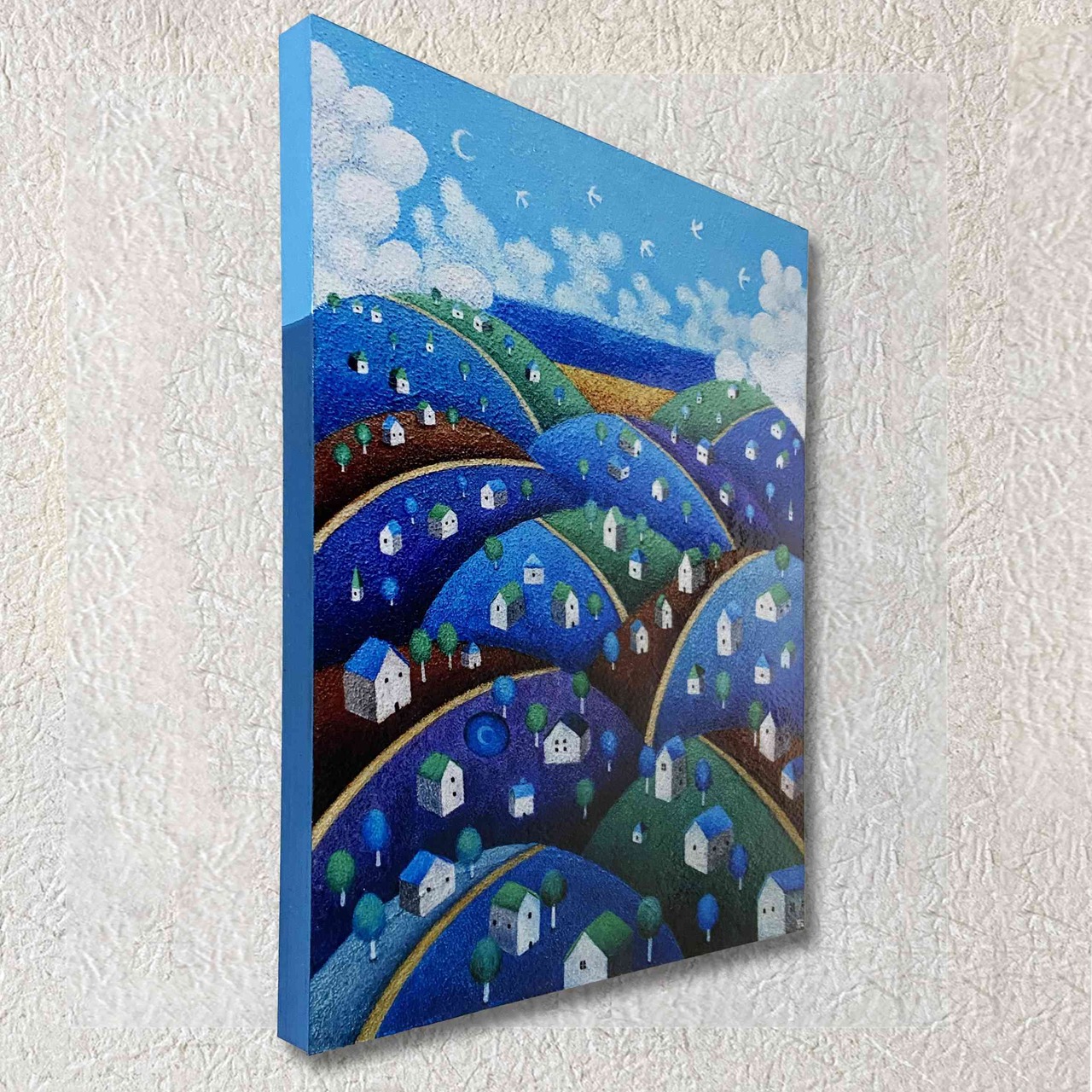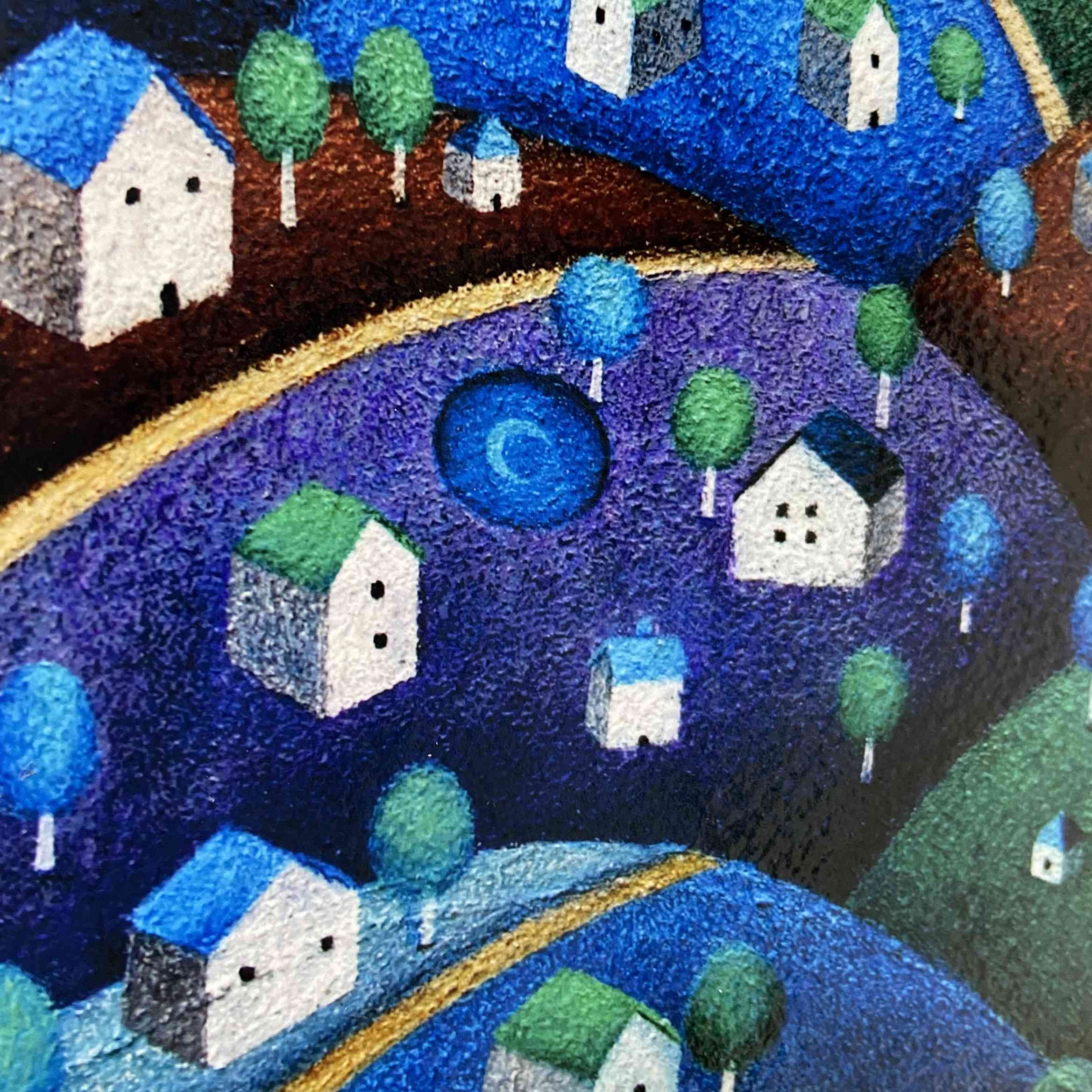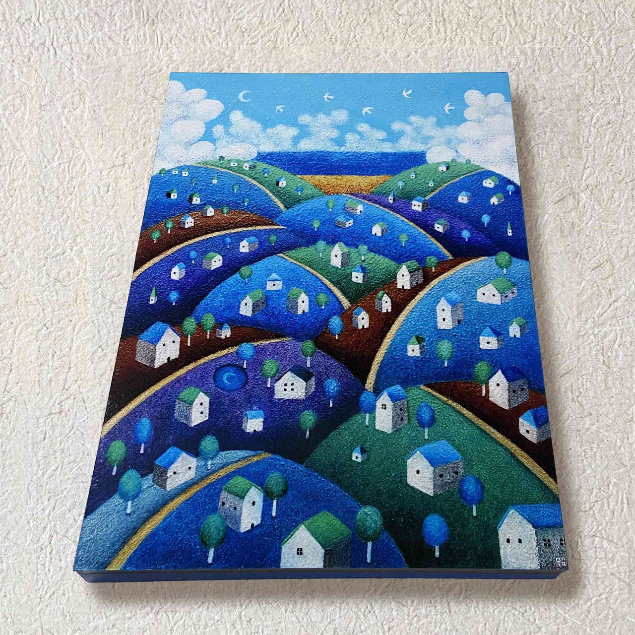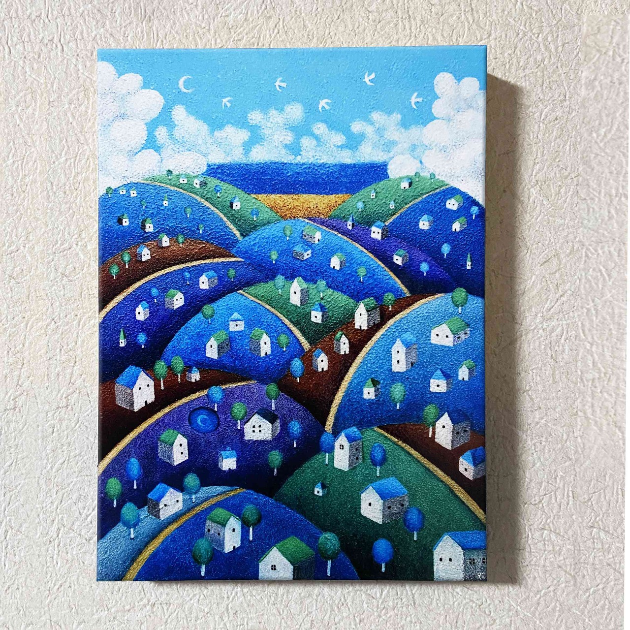 Story :可愛らしい家々が丘の上に立ち並び、頭上には平和の象徴の白い鳩が飛び交う 様子を描きました。 優しさ・あたたかさ、を感じて頂けますと幸いです。