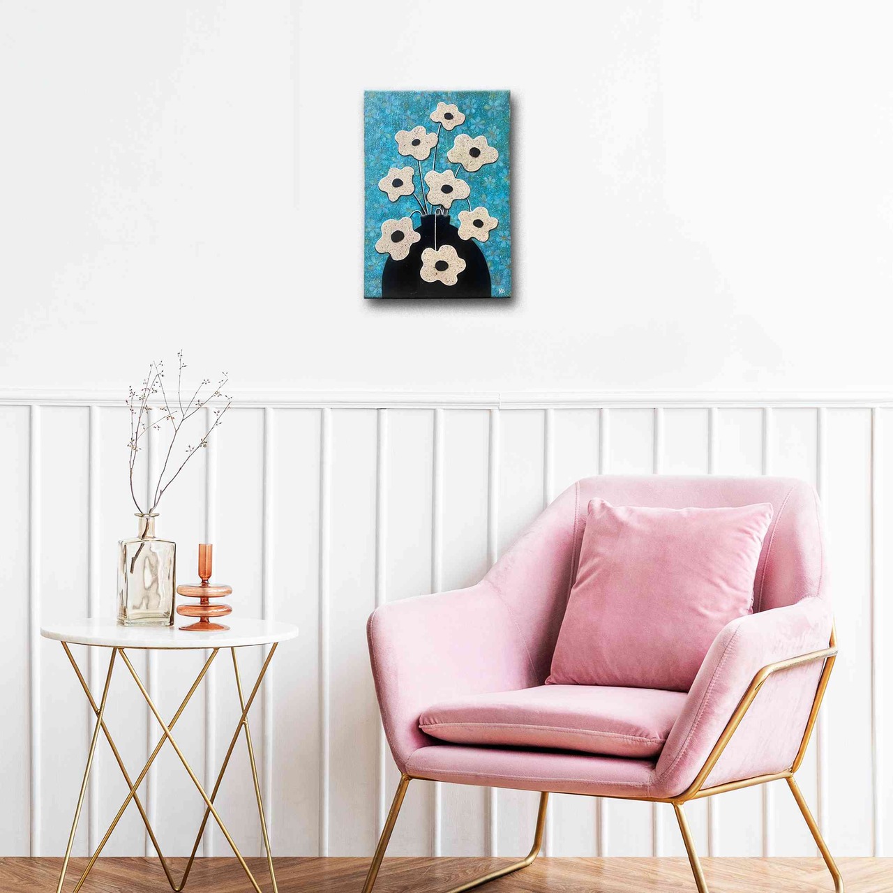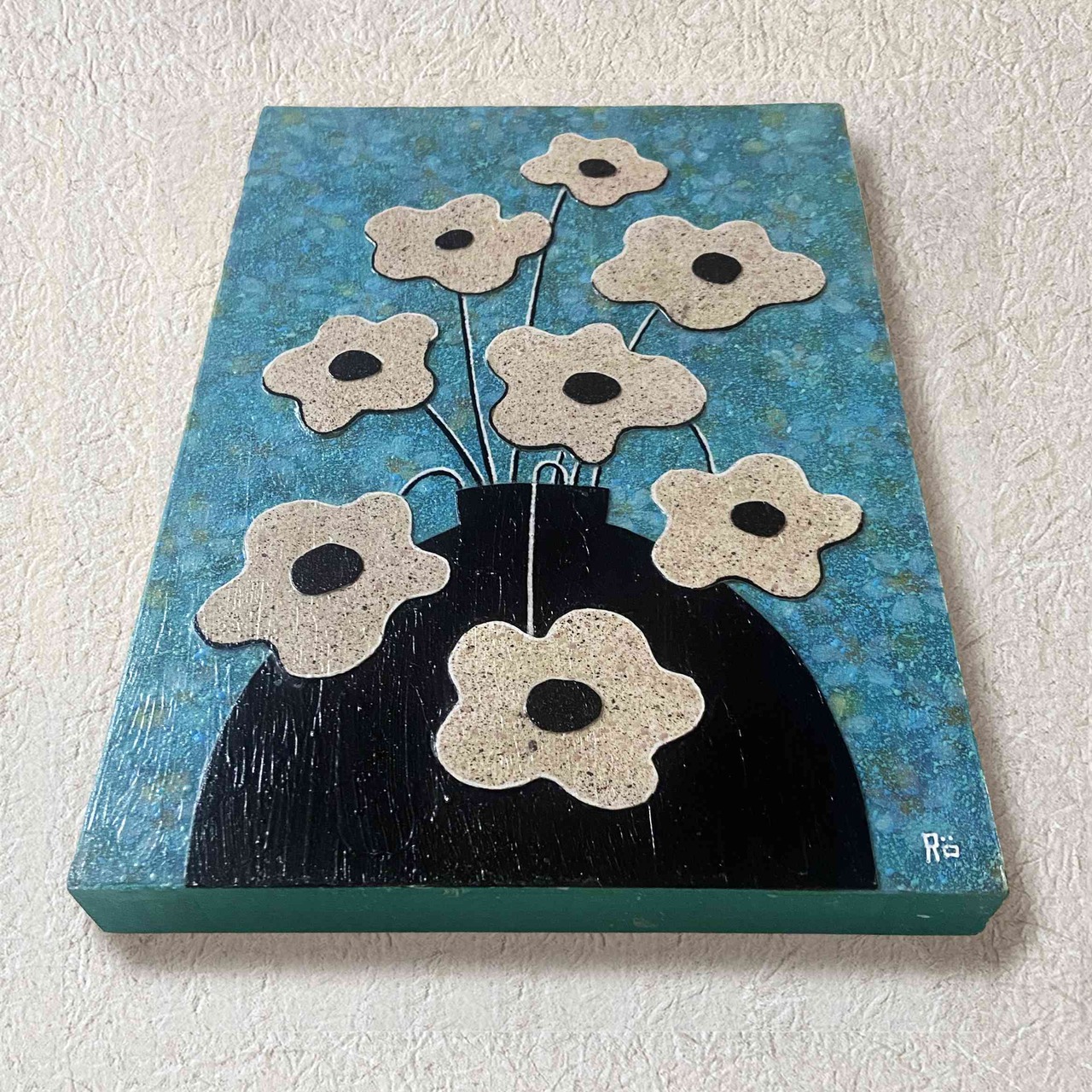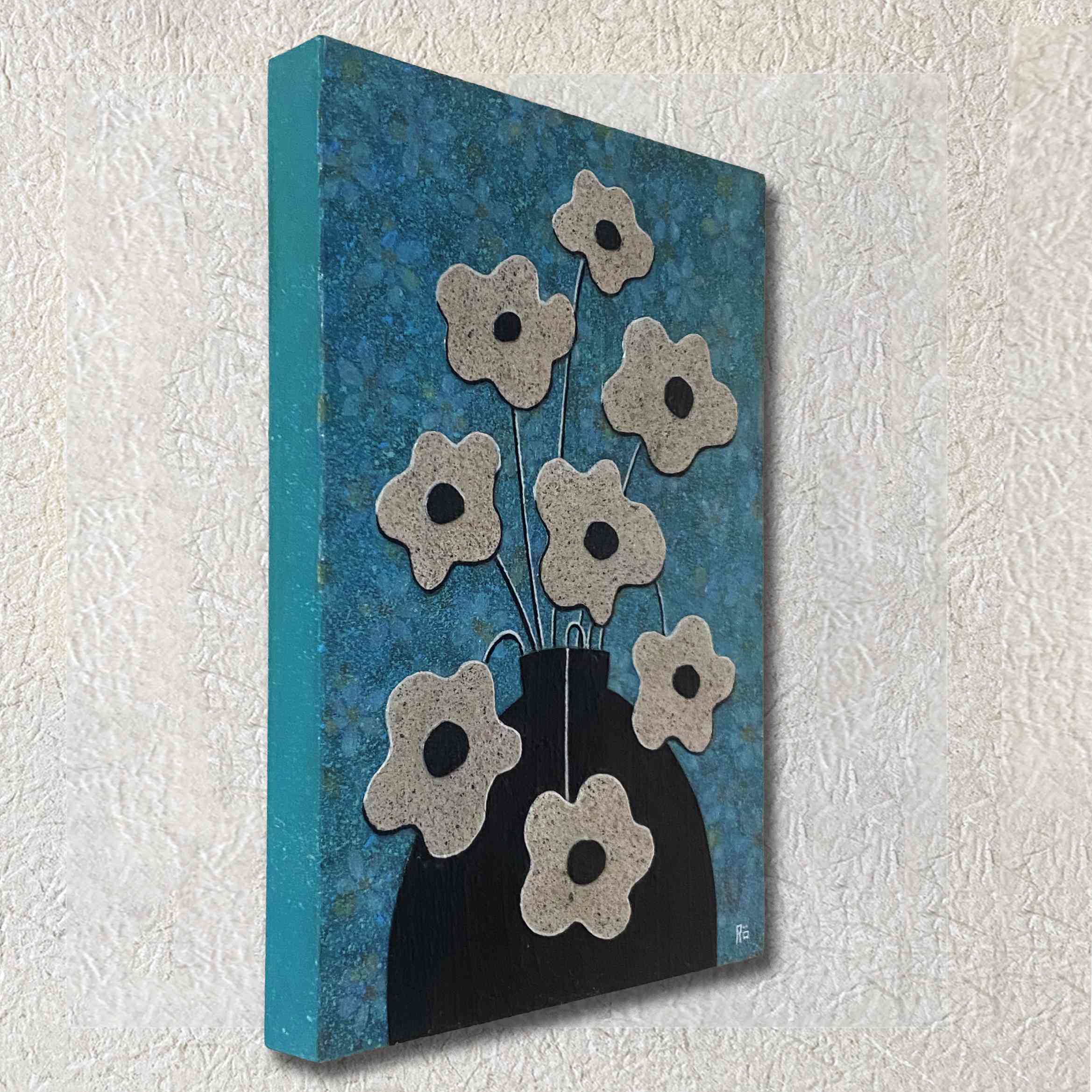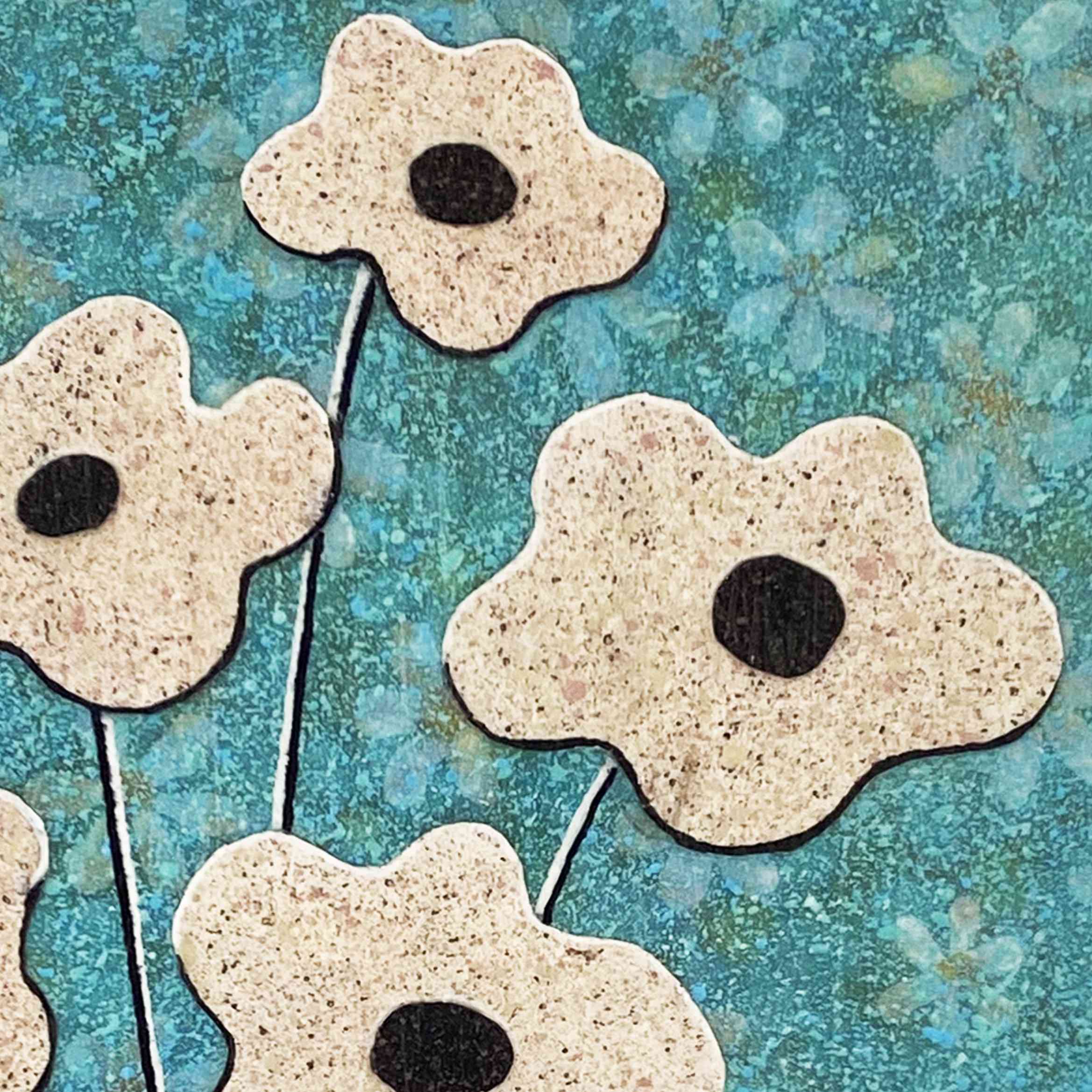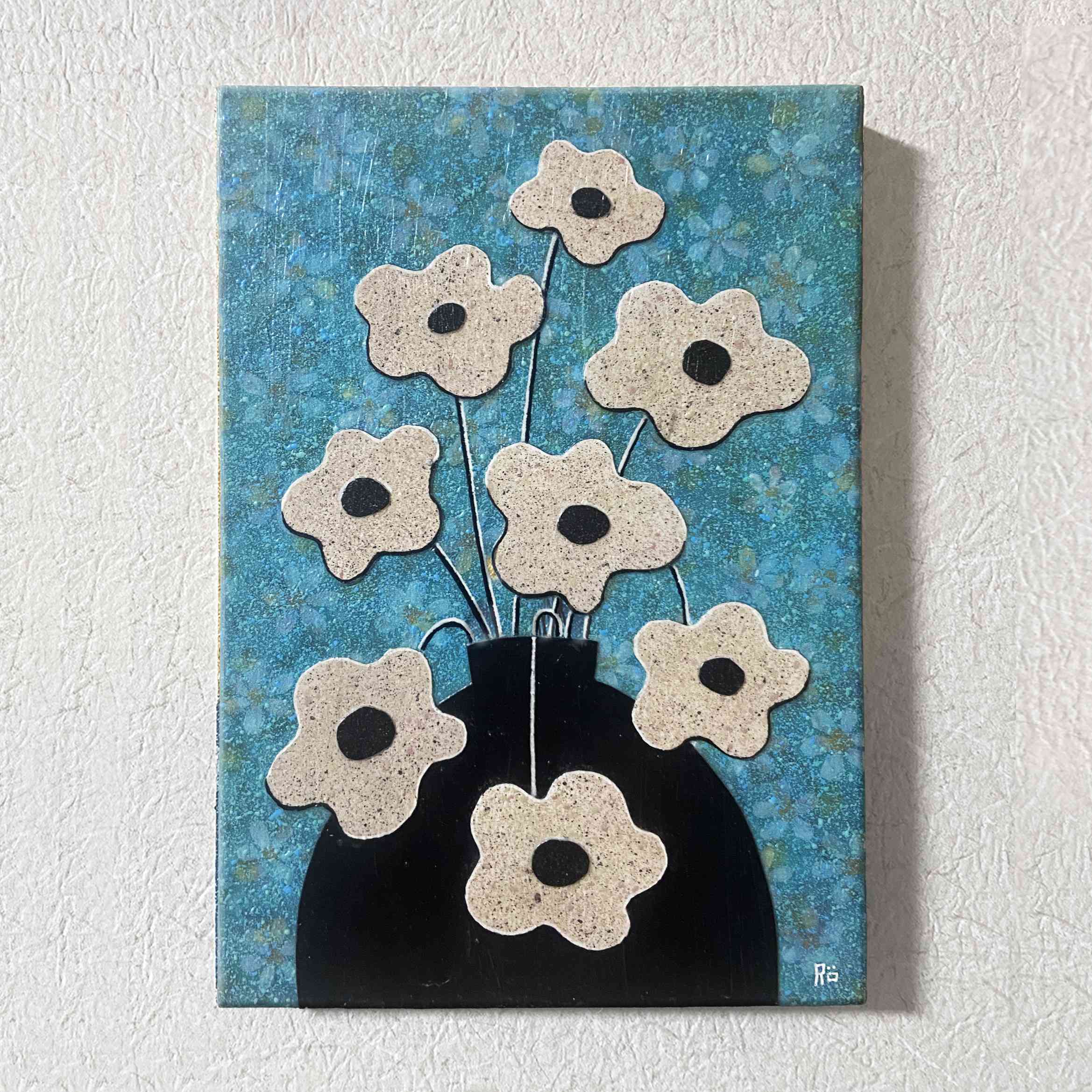 ブルーの背景には空間いっぱいに十数の花を描き、その上に塗料を重ねた白い花のコラージュを配置いたしました。
