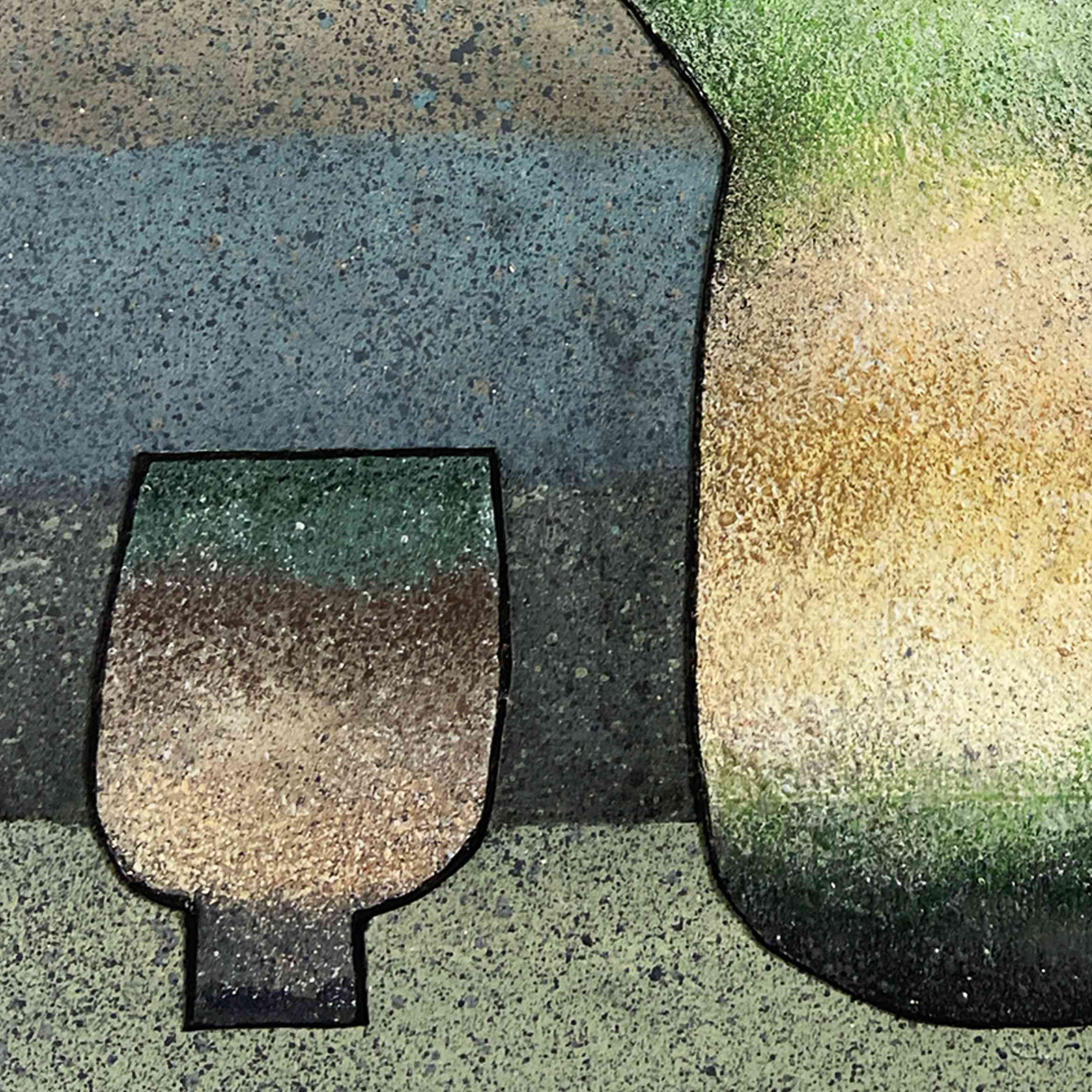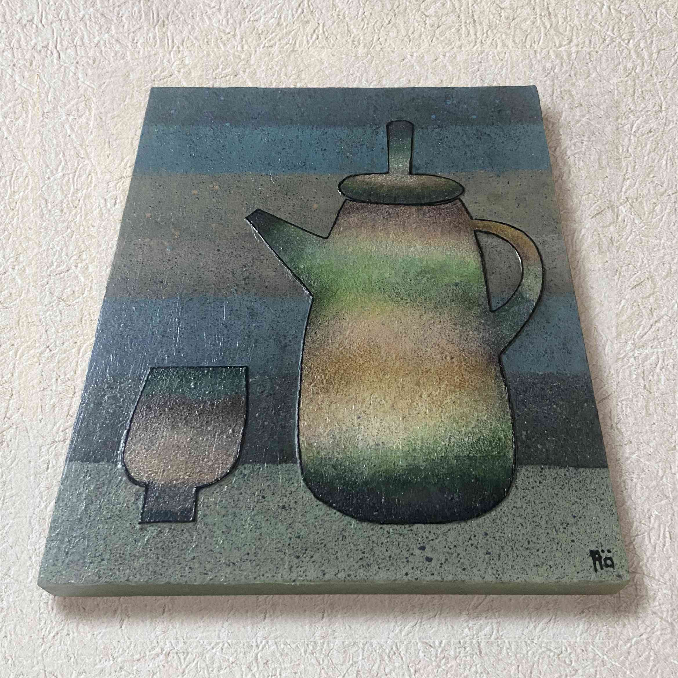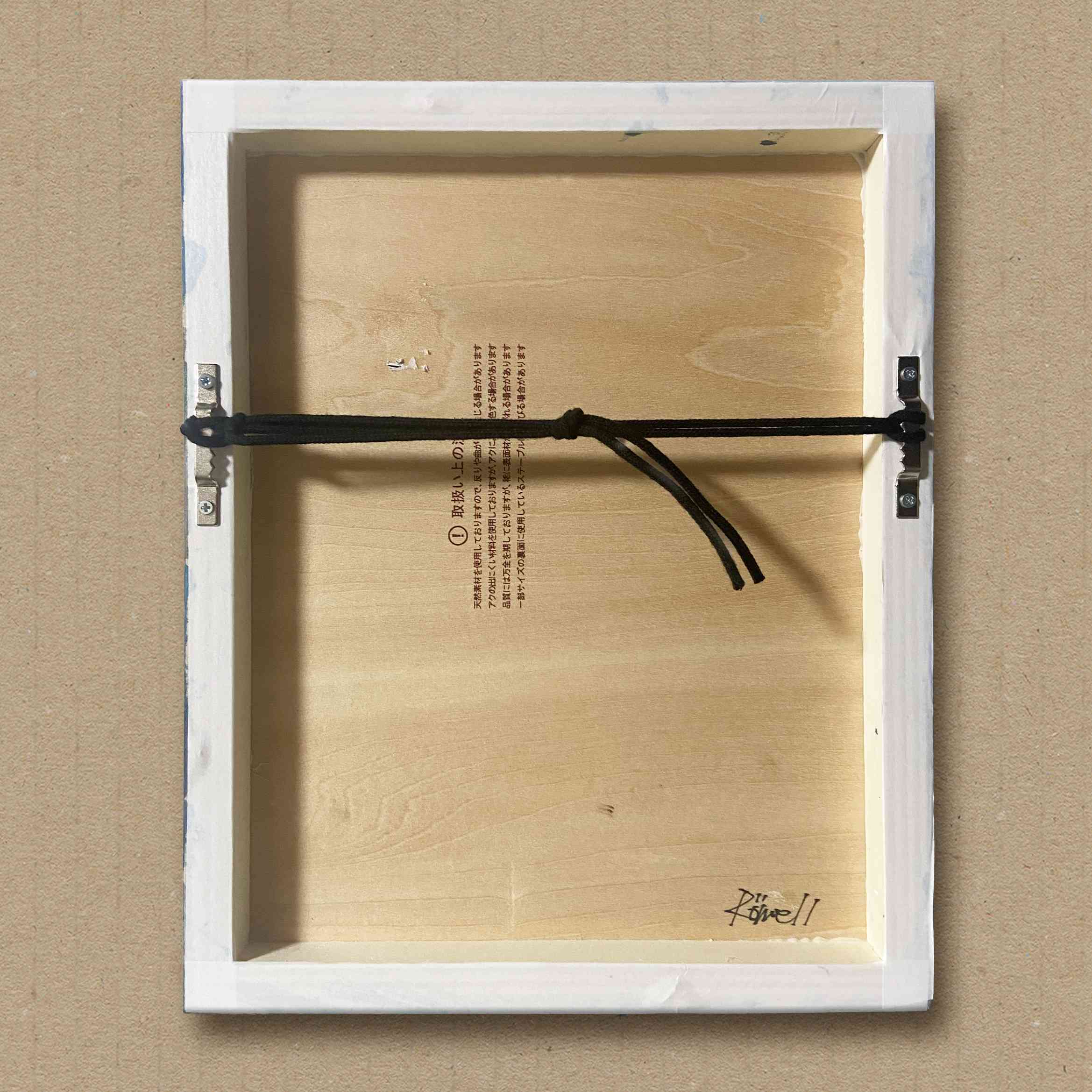 支持体に凹凸をつけ、独自技法による無数の粒子で陶器のような質感を演出し、塗料に漬けた高級水彩紙でコラージュした作品です。